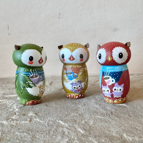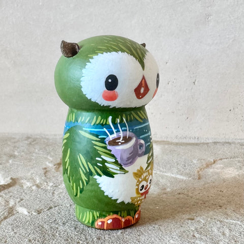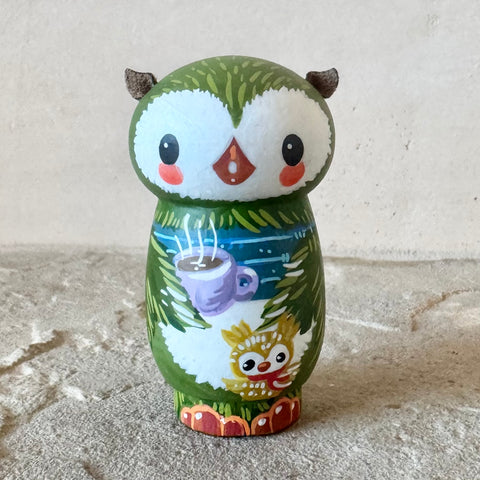 3” Winter Friend: Owl with Cocoa and Chick (Green)